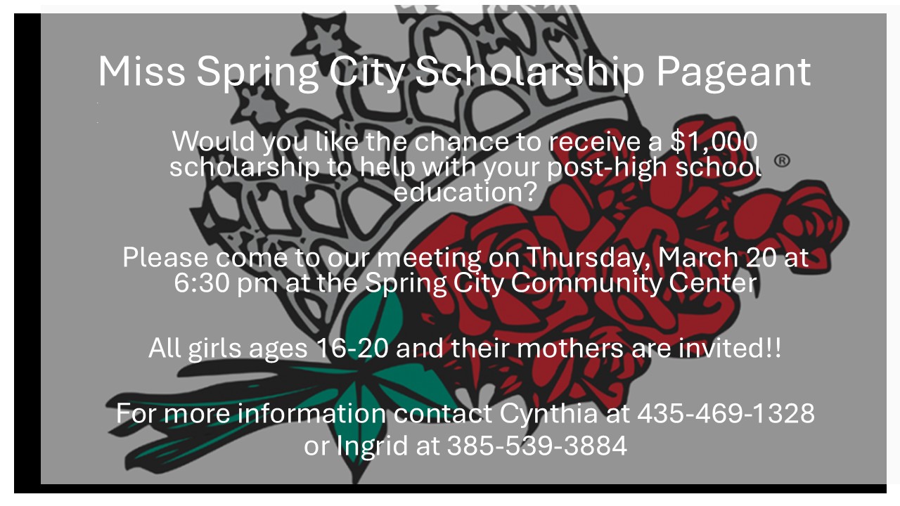 The Miss Spring City Pageant was held on April 26, 2025. Thank you to Cynthia DeGrey, Madi Sorenson, Ingrid Seegmiller, and Christi McGriff for their diligent work in producing the pageant! The Royalty is as follows